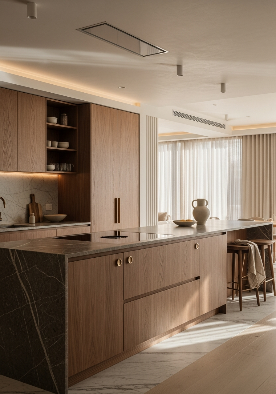 Dark luxury kitchen design succeeds when materials perform optical work—reflecting and structuring light through engineered surfaces rather than absorbing it. Here's how to execute moody metals without spatial compromise.