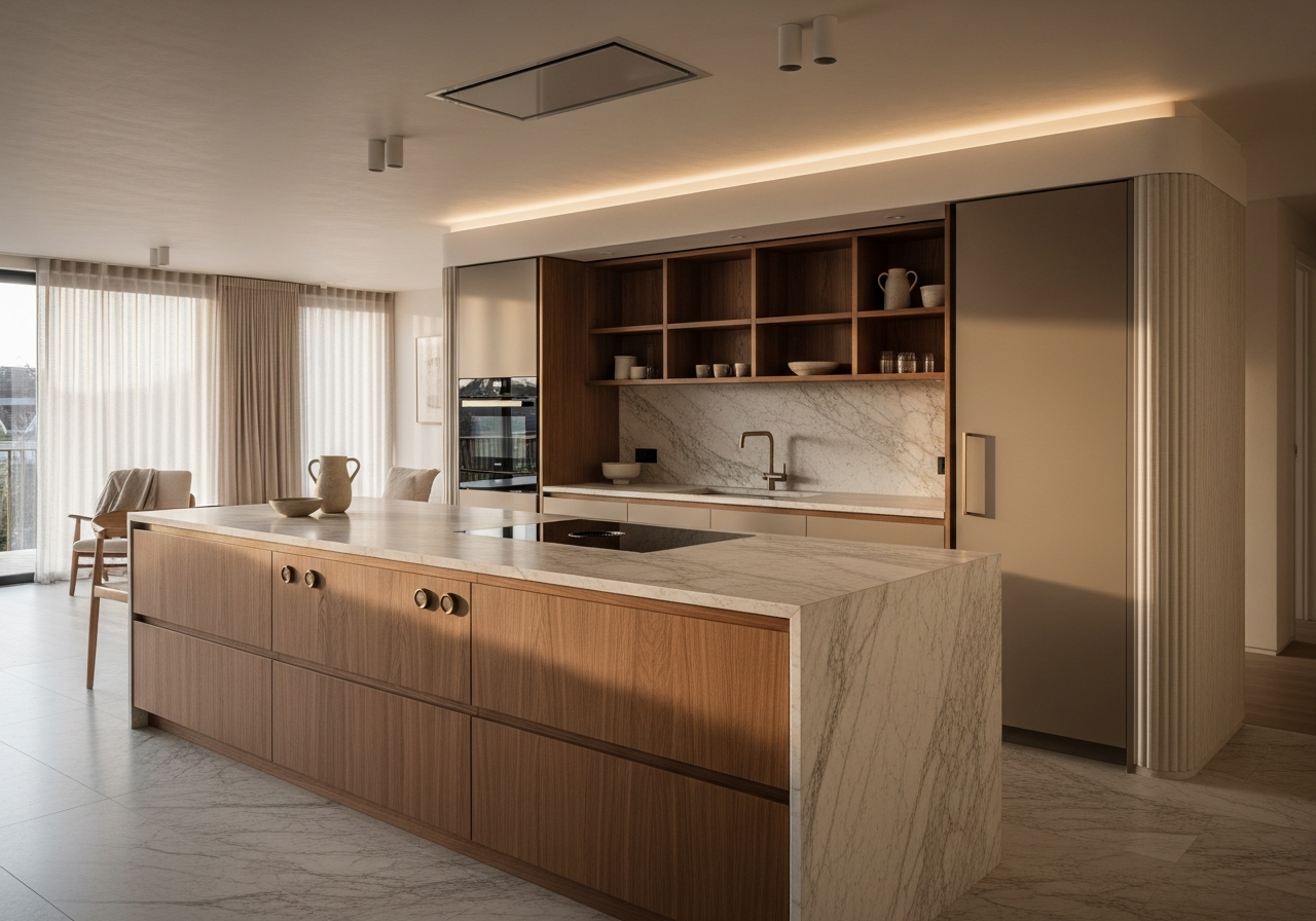 Cost structure follows capability. PVD requires vacuum chamber processing with cycle times and energy consumption that scale non-linearly with cabinet volume. The investment is architecturally justified for statement pieces—island bases, feature panels, hospitality installations—where metallic authenticity commands premium positioning. For full residential kitchens, 220°C powder coat in 80+ color options delivers equivalent functional lifespan at substantially lower lifecycle cost.