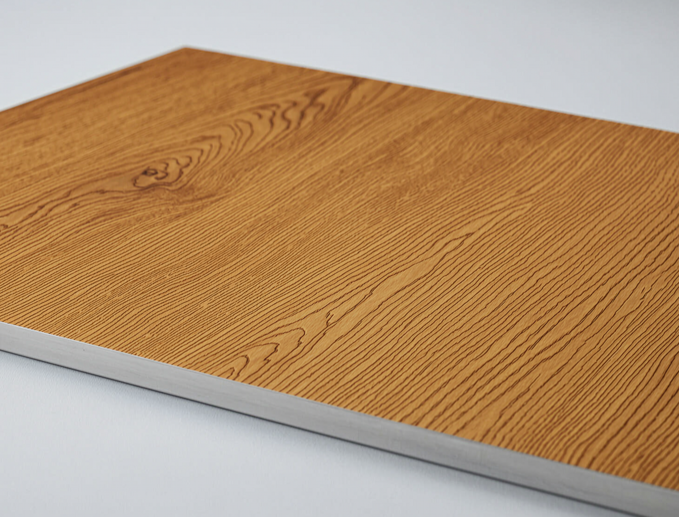 Visual: photorealistic, ΔE<2.0 vs. reference timber. Tactile: cooler (thermal conductivity 16.2 vs. wood 0.12 W/m·K), smoother (Ra 0.3-0.4 μm vs. sanded wood 5-20 μm). Texture options: Standard (visual only), 3D Embossed (+0.15 mm relief), Deep Sculpt (+0.25 mm relief). Note: deeper textures increase surface area and cleaning attention requirements.