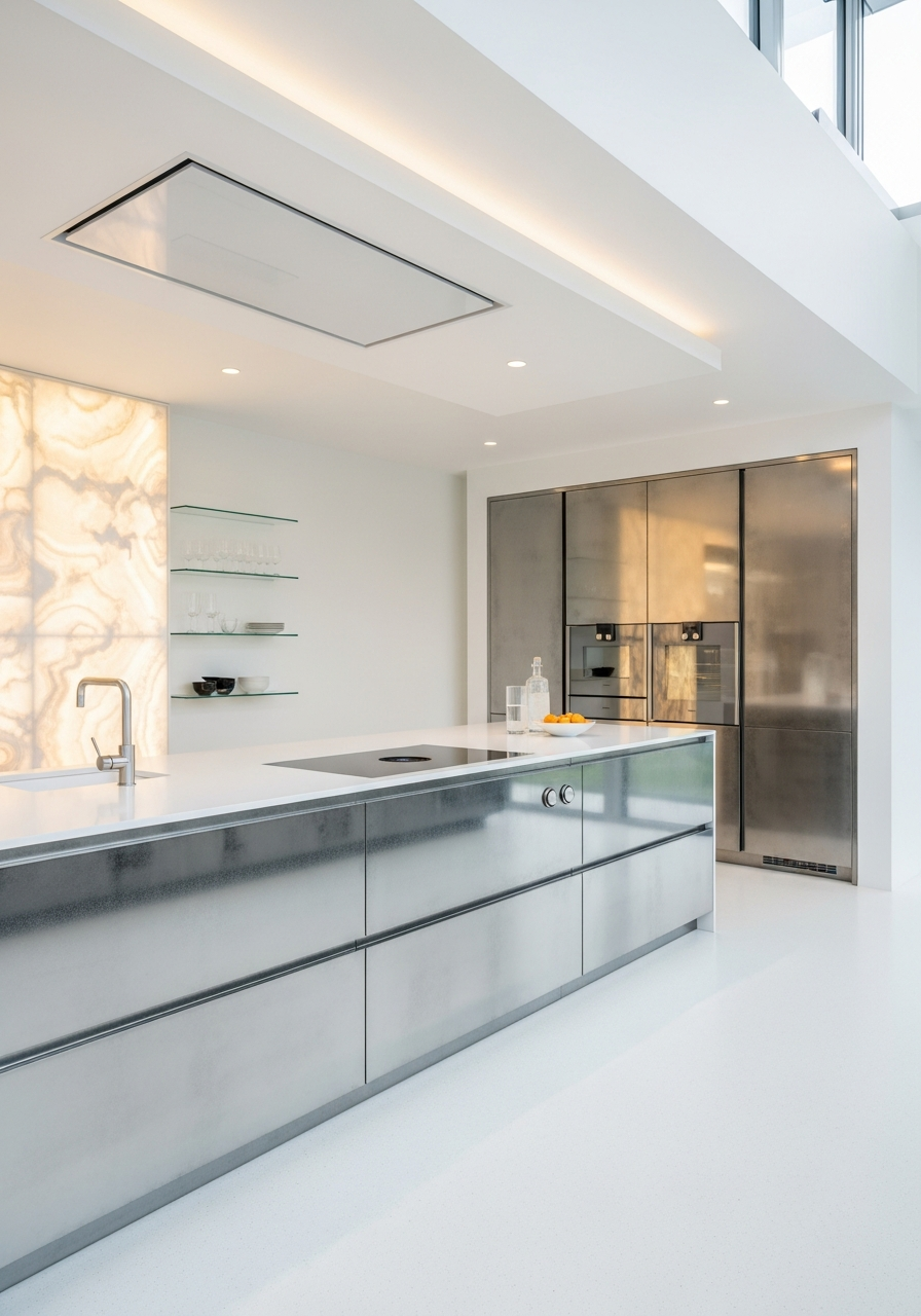 Translucent amber-white panels with internal LED arrays provide warm ambient illumination without daylight dependency. The backlighting transforms cabinetry into luminous architectural elements, enabling the kitchen to function as a controlled artificial environment.