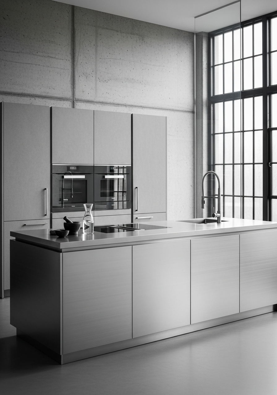 The composition reads as pure architectural mass and void. Horizontal brushed 304 stainless steel grain runs continuous across base cabinets and integrated countertop, catching diffused daylight with controlled matte sheen — never warm, never reflective chaos. Matte grey porcelain stoneware tall units present 3mm micro-texture concrete-like surfaces in cool neutrality, their vertical rhythm anchored by black anodized aluminum hardware as precise linear accents. The palette rejects every warm tone: natural silver steel, medium concrete grey as dominant field, dark charcoal in recesses, pure black at points of contact. Strong diffused illumination from industrial-scale windows eliminates shadow drama; surfaces exist in even, cool light. No wood grain, no textile softness, no decorative object interrupts the material dialogue — only steel, stone, and the negative space between them.