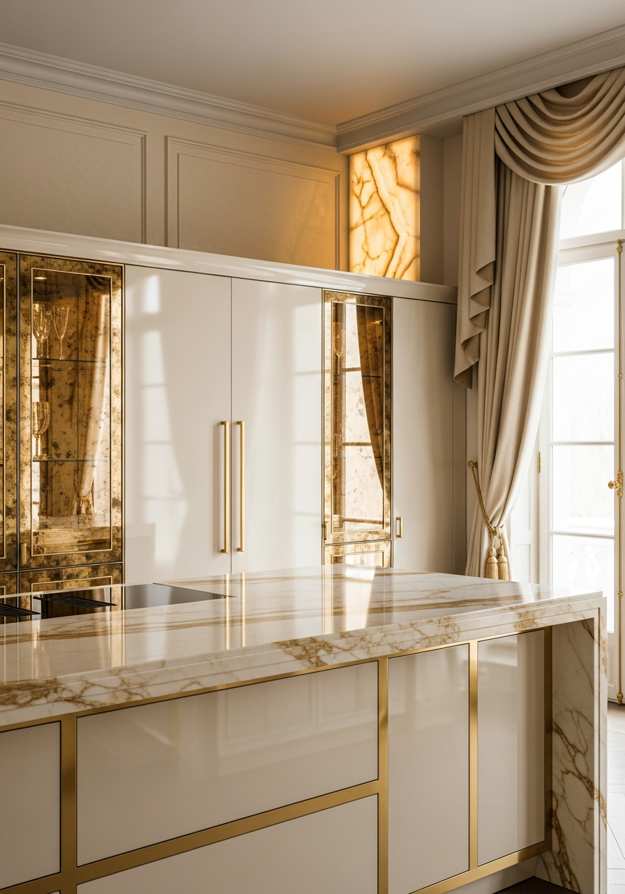 The composition reads as layered sheen governed by warmth. Mirror-polished champagne gold profiles establish vertical rhythm at the island perimeter, their reflectivity shifting from brilliant to muted as viewing angles change. Satin-finish gold panels occupy the field, providing rest for the eye. Cream lacquer doors interrupt the metallic plane with depth rather than contrast — their high-gloss surface holds reflections like still water, the warm ivory tone preventing coolness from entering the palette. Gold-tinted antique mirror glass panels on display units introduce controlled distortion, the slight visual waviness catching light like desert mirage. Honey onyx channels glow from within, their amber translucence suggesting geological time and solar accumulation. The overall effect is atmospheric richness: not minimal, yet disciplined; warm, yet precise.