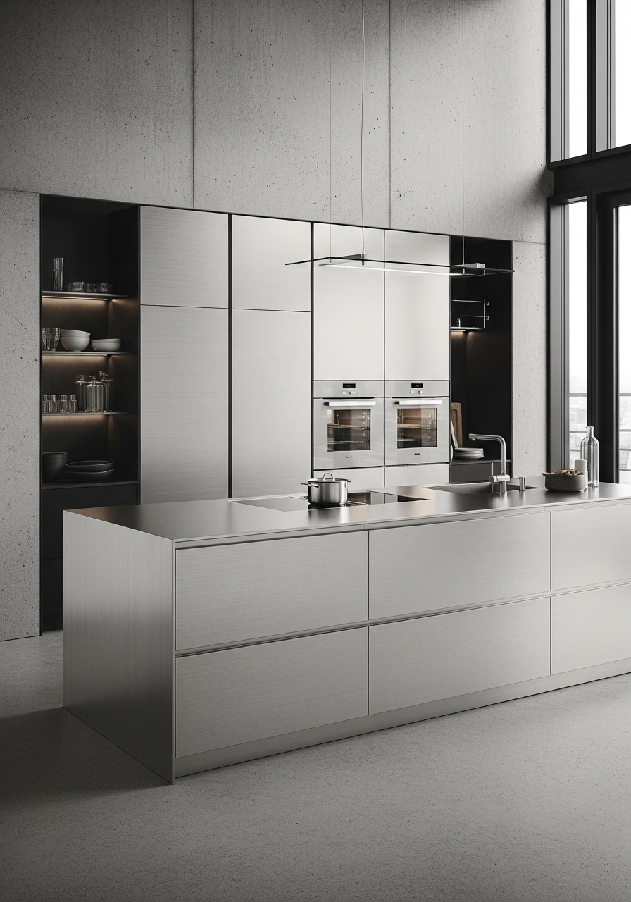 The Urban Stone Minimal aesthetic rejects warmth entirely. Cool industrial metallics, neutral concrete greys, and pure achromatic blacks create spaces calibrated for abundant diffused daylight. The 4mm folded-edge stainless steel countertop with welded corners maintains continuity with the cabinet front plane, while the 3mm micro-texture porcelain cladding provides concrete-like surface variation without timber, textiles, or decorative softness — only material precision and spatial discipline.