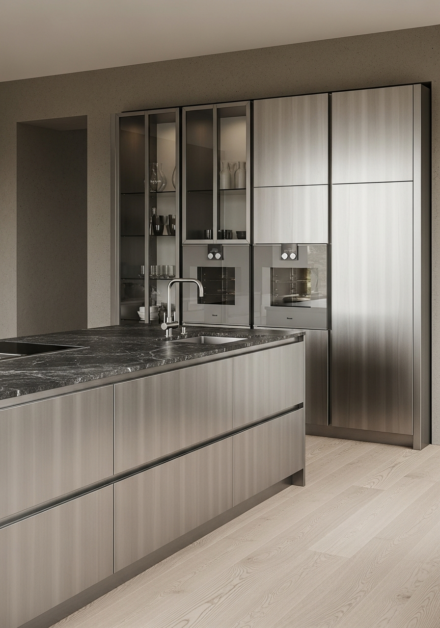 The kitchen reads as architectural meditation: seamless brushed steel cabinetry under soft clerestory light from above, zero visible handles or hinges, gunmetal grey aluminum frames defining upper glass elements with precision shadow-gap reveals. The 400-grit longitudinal grain catches directional light in subtle texture variation — never high-gloss reflection, always warm metallic presence. At close range, concealed soft-close mechanisms integrate into seamless one-piece bent steel construction with no visible joints. Material palette balances brushed steel silver, pale ash blonde timber, Pietra Cardosa grey stone, and gunmetal grey framing — proportional calm replacing decorative excess.