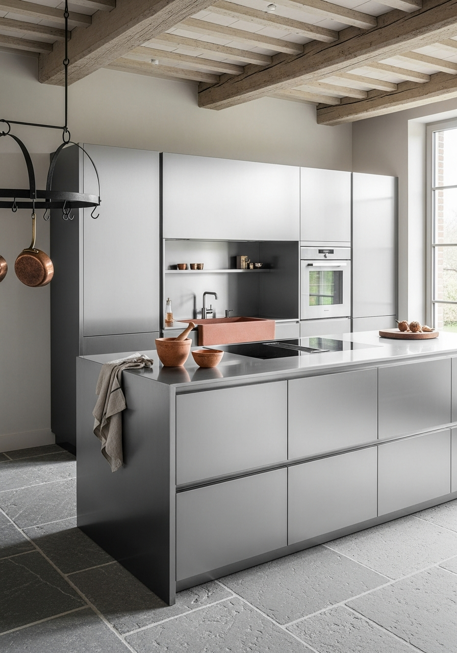 The kitchen reads as monolithic steel core — a single-material architectural statement where horizontal brushed grain runs 1200mm uninterrupted across panel modules, emphasizing spatial flow. Waterfall steel planes eliminate visual interruption between countertop, cabinet, and floor. Soft clerestory illumination reveals the longitudinal texture without glare; warm sienna terracotta and limed oak accents provide residential scale against the cool gunmetal mass. No decorative fixtures, no branding, no styling theater — only controlled proportion and material presence.