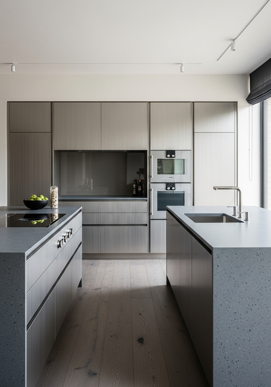 Directional brushed steel creates vertical rhythm that shifts with ambient light — cool grey in shadow, subtle warmth where daylight grazes the grain. The palette operates in narrow tonal bands: brushed steel grey, near-black slate composite, desaturated fumed oak flooring, and warm white ceilings that soften the machined volume. No open storage. No living elements. No color accents. The kitchen becomes a calm architectural volume where proportion, shadow gap reveals, and surface texture perform the design work. East-facing glazing delivers even, indirect light — sky visible as bright grey — eliminating reflectivity hotspots and allowing the vertical grain to read as intentional pattern rather than industrial default. Integrated appliances disappear behind touch-latch fronts; branding and logos are absent by specification.