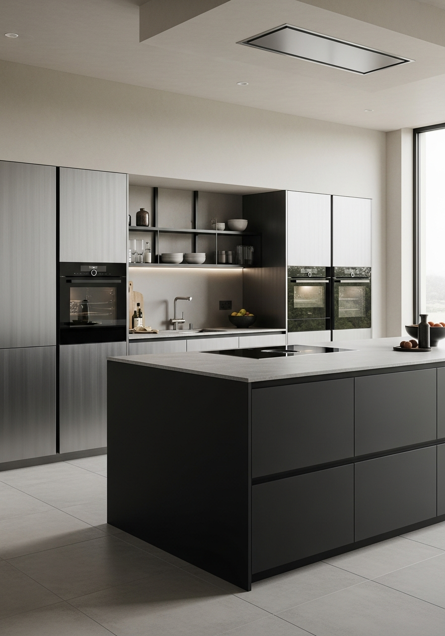 Surfaces absorb light through absolute matte black nanocoating while brushed longitudinal steel interiors catch and direct ambient illumination from concealed sources. All functional elements — hinges, pulls, lighting controls, appliance interfaces — are integrated or eliminated, creating a kitchen that appears to operate through intention rather than mechanism. The aesthetic rejects warmth and craft in favor of precision, silence, and the calm of engineered darkness.