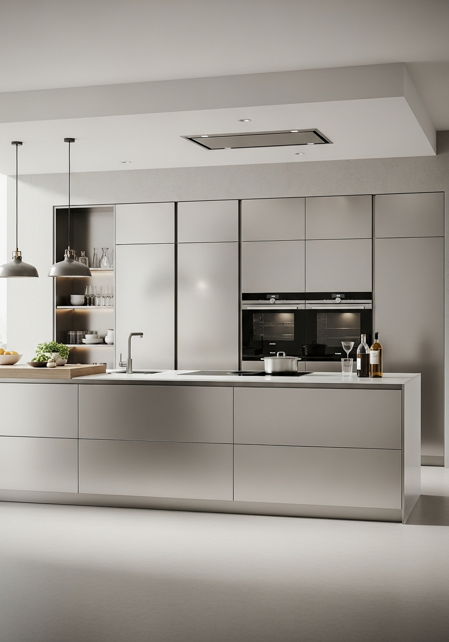 Deep anthracite panels employ Italian nanotechnology laminate with thermal healing properties: micro-scracks close under heat, fingerprints resist adherence, and the super-matte surface maintains soft-touch warmth against cool metallic planes.