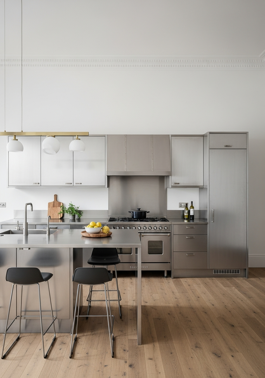 304 stainless steel kitchen system with exposed bar-frame joinery — seamless construction, zero formaldehyde, honest industrial modernism.