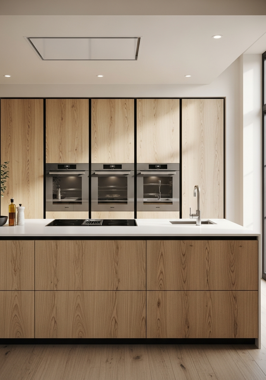 304 stainless steel kitchen system — seamless construction, zero formaldehyde, quiet Japandi oak