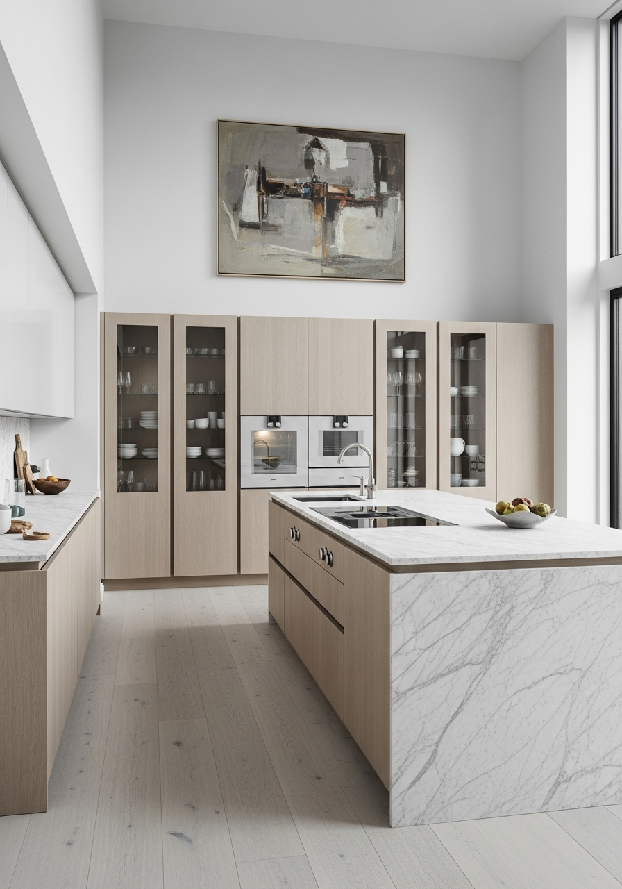 The Abyss system scales from compact galley kitchens to expansive open-plan environments while maintaining proportional discipline. The dual-surface composition — oak bases, parchment uppers — creates visual lightness that suits smaller spaces, while the hand-forged steel framing and shoji-inspired screen panels provide architectural presence in larger rooms. Fadior's design team adjusts island dimensions, tall unit proportions, and the oak-to-white ratio based on natural light orientation and spatial flow requirements.