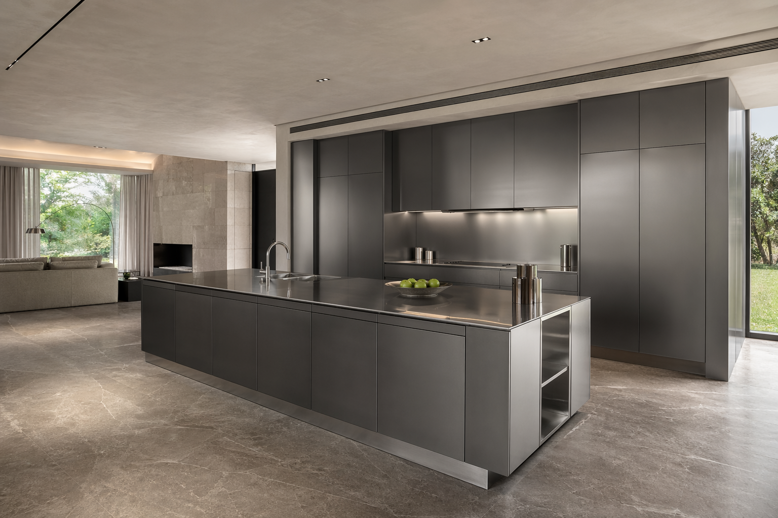 | Finish Direction | matte graphite door fronts with brushed 304 stainless steel profiles and a restrained stone worktop |