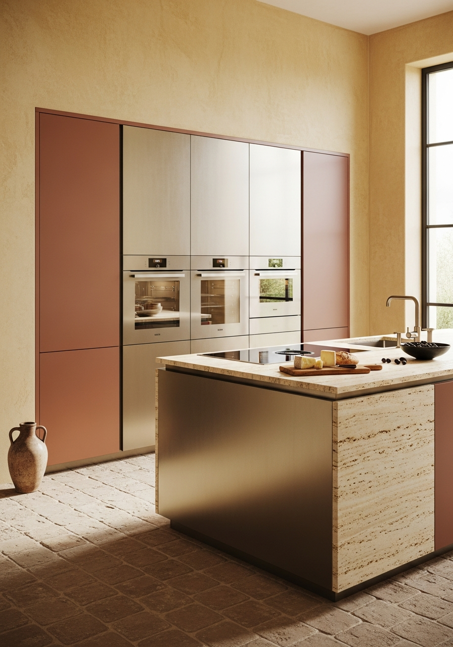 Select cabinet fronts carry baked-earth terracotta tone in flat matte lacquer — a deliberate material contrast to metallic surfaces. The absorbent, non-reflective finish grounds the composition in Mediterranean material honesty while the 304 steel body provides structural integrity.
