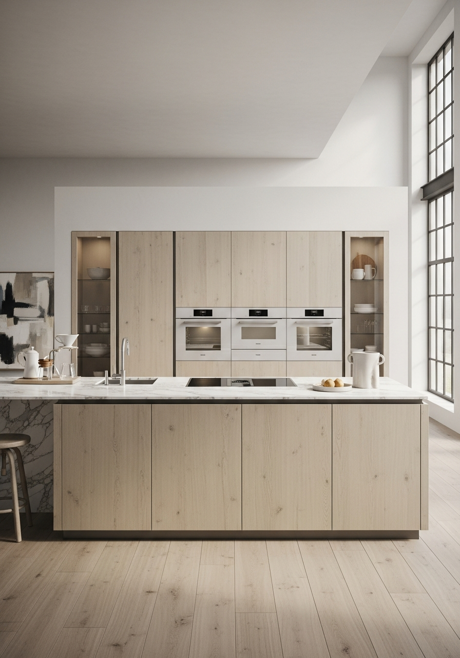 The composition reads as gallery-informed residential architecture — spaces feel collected over time rather than decorated. Quarter-sawn oak grain provides vertical tactility without visual noise, while eggshell white lacquer surfaces absorb rather than reflect light. Natural brushed stainless steel at edges and junctions maintains structural honesty. Proportion, shadow-gap reveals, and restrained detailing perform more work than ornament. The overall effect is generous, diffused, and intentionally unstyled — a kitchen that recedes to let daily life take focus.
