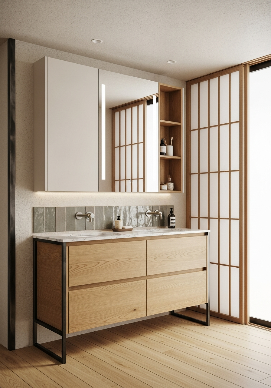 Hand-forged iron and honey oak on seamless steel — a Japandi vanity shaped by morning light and zero-formaldehyde construction.