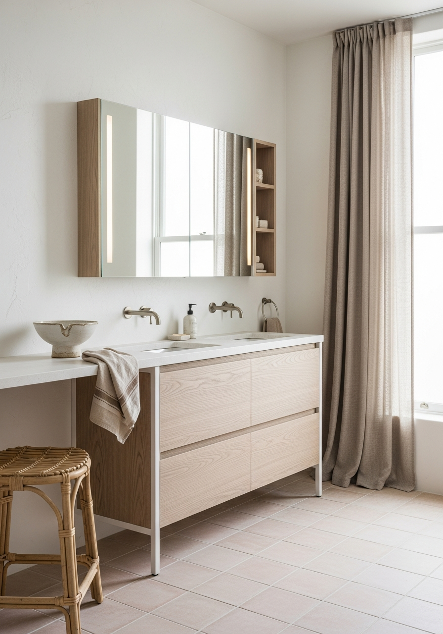 | Configuration | Wall-mounted double vanity with integrated mirror cabinet and open shelving |
