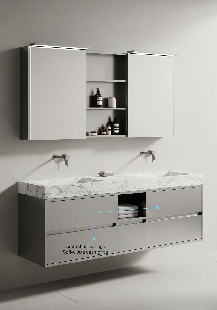 | Layout | Wall-mounted double vanity with integrated mirror cabinet and open shelving |