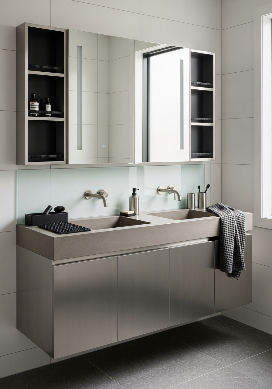 | Layout | Wall-mounted double vanity with integrated mirror cabinet and open shelving |