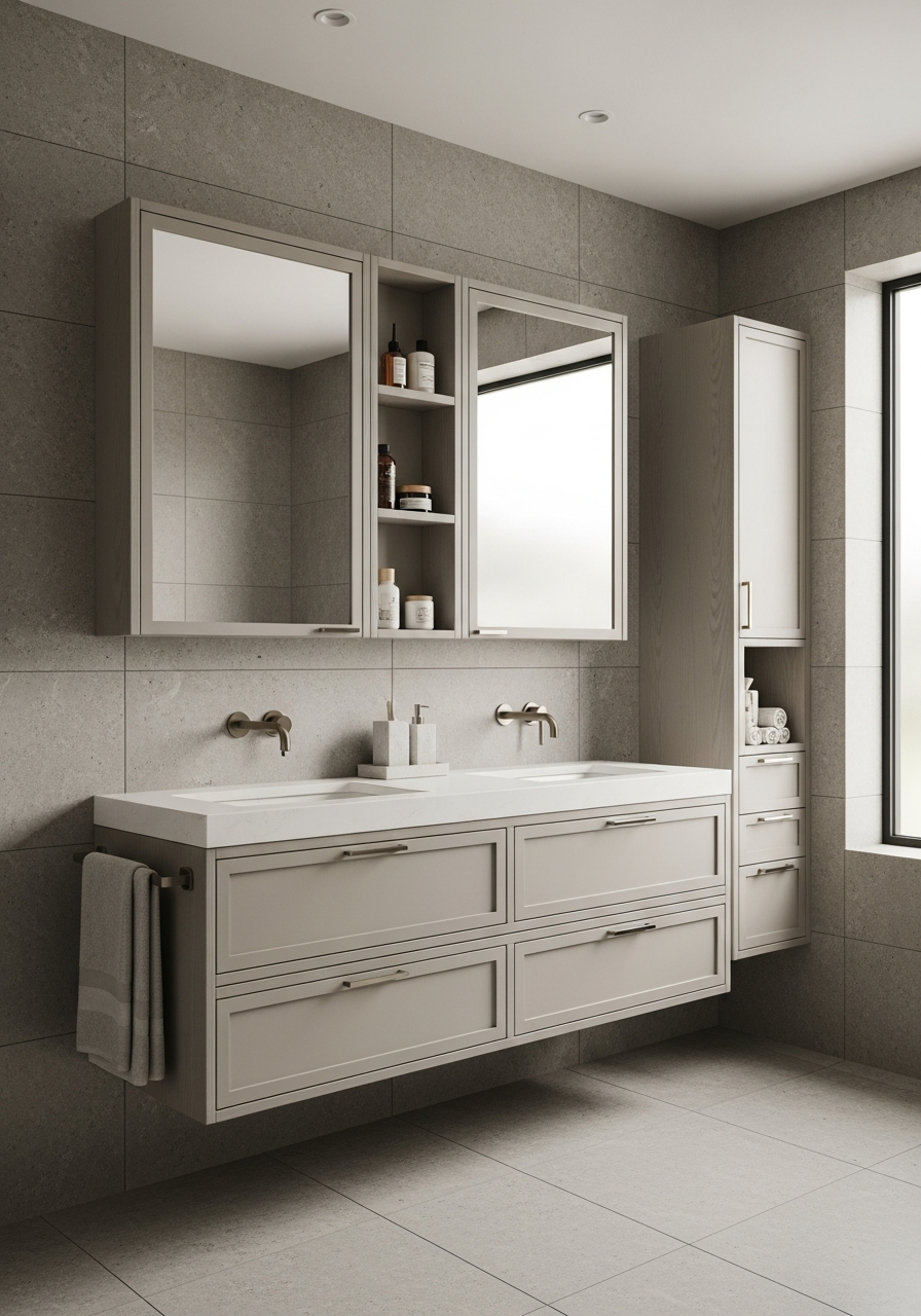 | Layout | Wall-mounted double vanity with integrated mirror cabinet and open shelving |