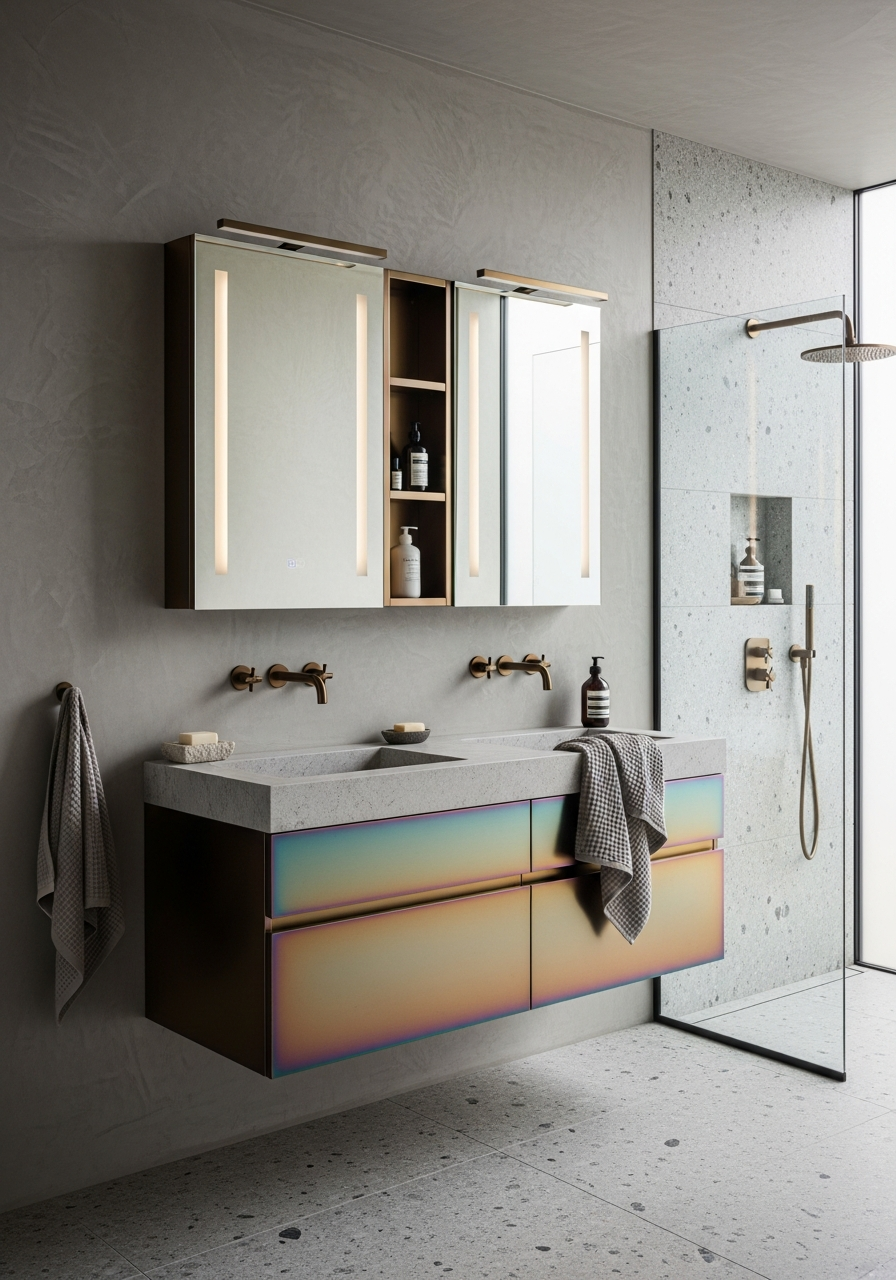 | Layout | Wall-mounted double vanity with integrated mirror cabinet and open shelving |