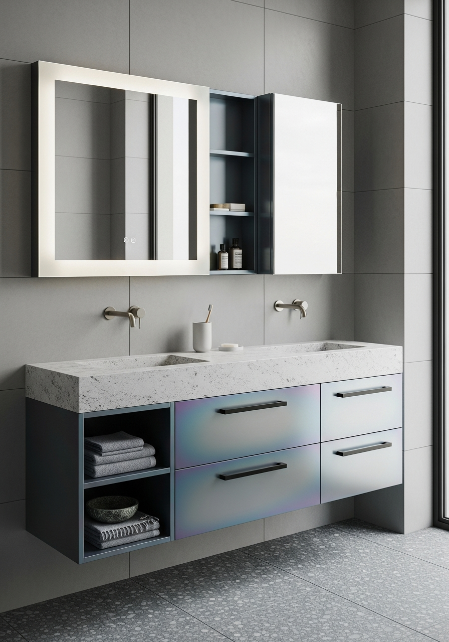 Spectral minimalism where chromatic steel meets mineral stone — a vanity system engineered for absolute surface continuity.