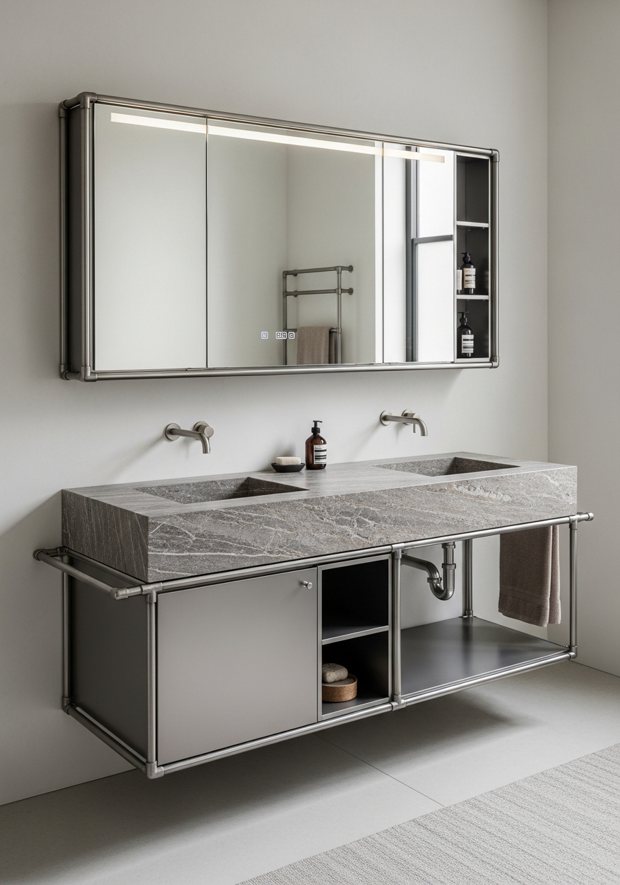 | Layout configuration | Wall-mounted double vanity with integrated mirror cabinet and open shelving |