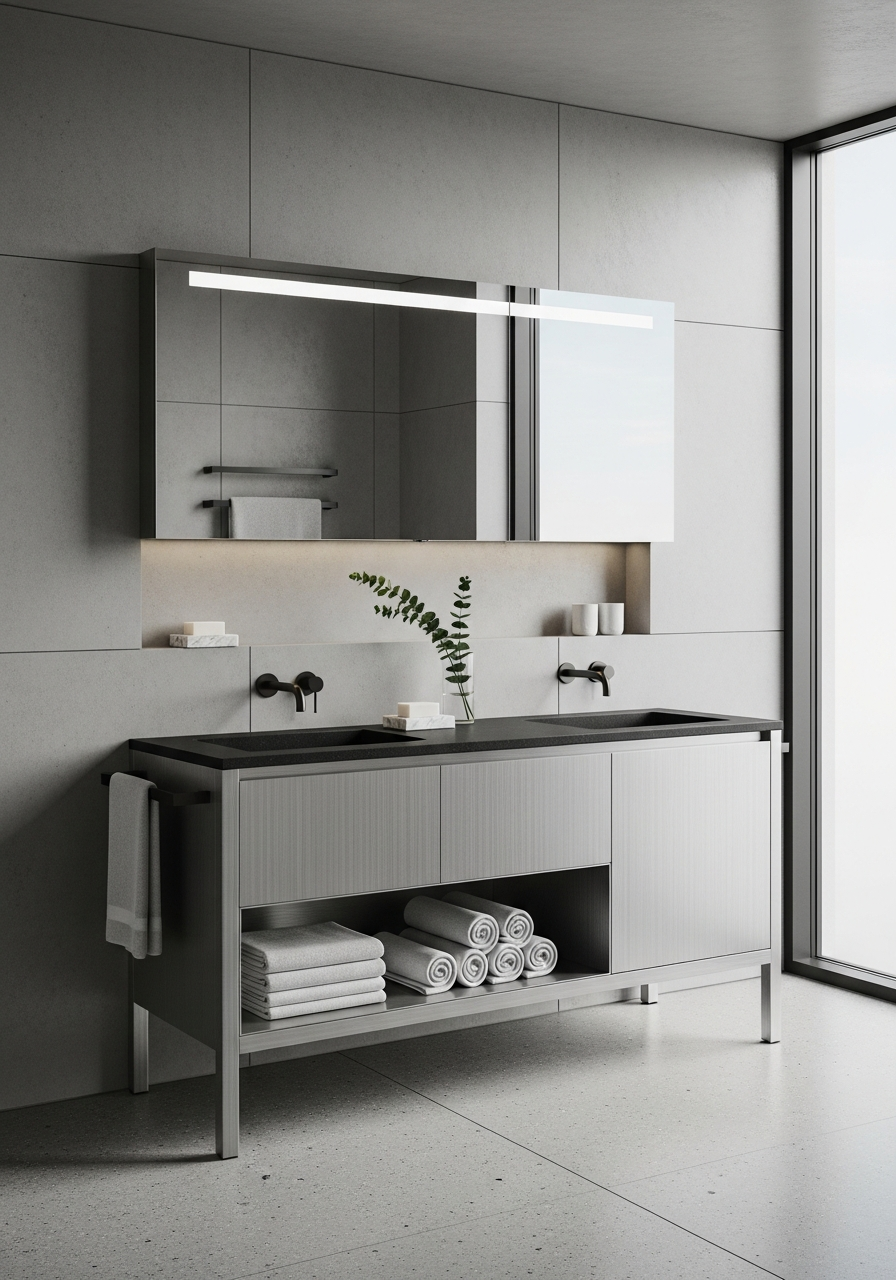 Architectural precision meets material honesty in a zero-formaldehyde, seamless stainless steel vanity system.