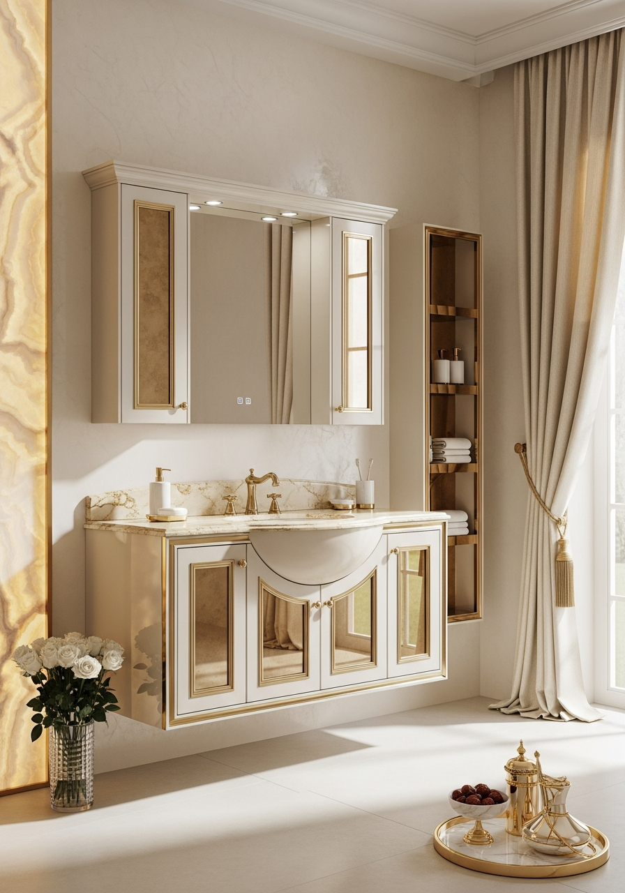 The composition reads as protected, cultivated luxury — a sun-drenched opulence drawn from amber-lit Moroccan riads and Persian palace baths. Warmth radiates from every surface: molten gold that breathes rather than blares, cream surfaces with the depth of aged ivory, light filtering through honeyed stone like desert sunset through linen drapes. Mirror, lacquer, metal, and onyx conspire to create an atmosphere where materials are polished to catch and hold warmth. Proportion, vertical rhythm, and restrained detailing do more work than decoration — the mirror cabinet and open shelving maintain clean lines while the champagne gold frame provides luminous structure against the cream lacquer volumes.