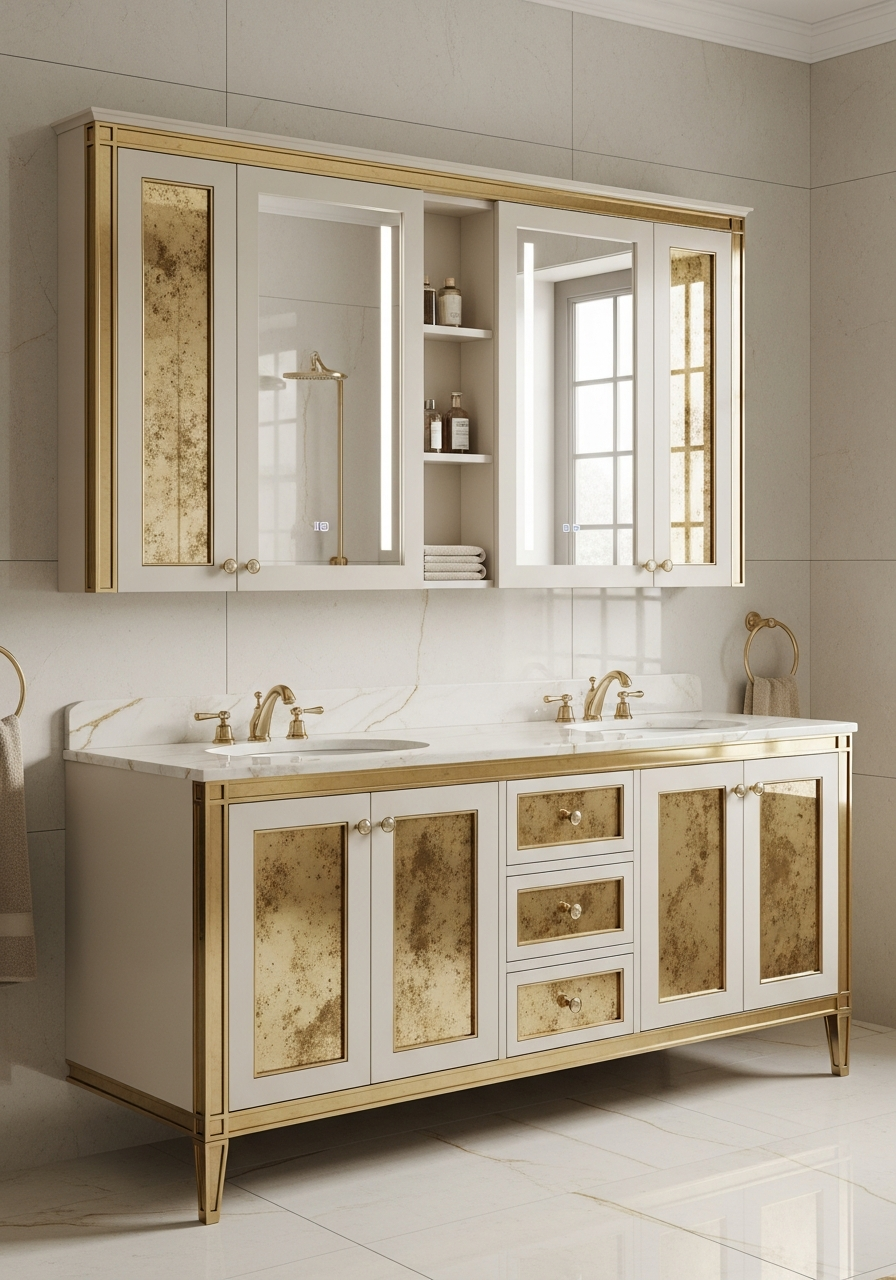 Gold-tinted antique mirror glass display niches feature subtle warm distortion achieved through controlled oxidation of the silvering layer — a deliberate departure from clinical mirror clarity. The effect reads as collected heritage rather than new manufacture, while the 304 stainless steel cabinet structure provides the dimensional stability required for large mirrored panels in high-humidity applications.