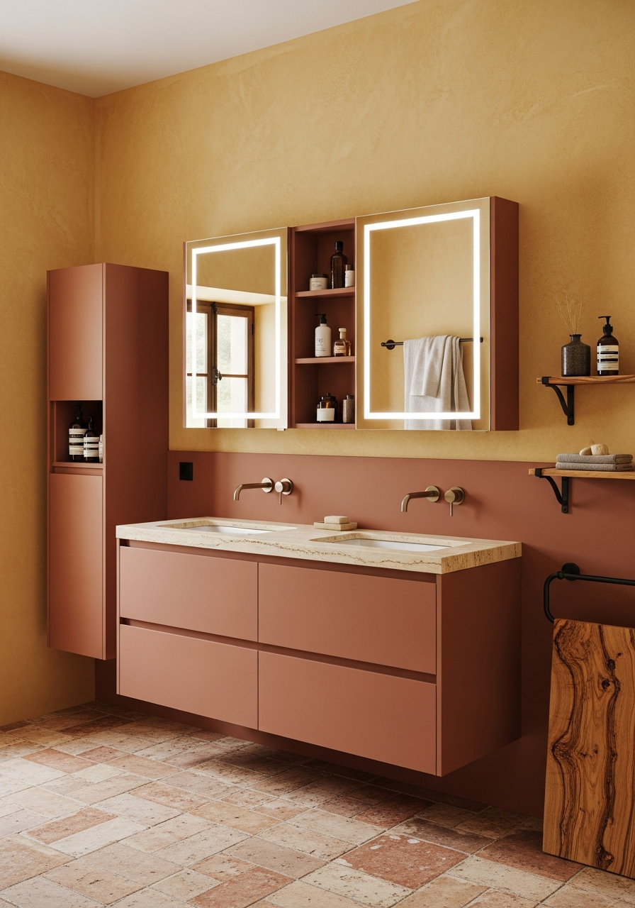 | Configuration | Wall-mounted double vanity with integrated mirror cabinet and open shelving |