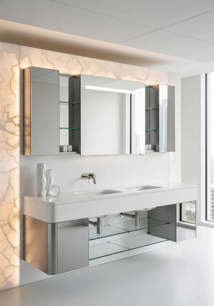 The Acqua Luminous Vanity adapts to project-specific dimensions, internal storage configurations, and finish balance while maintaining its core material discipline. Fadior offers 80+ powder coat colors baked at 220°C for non-reflective surfaces, PVD metallic finishes including bronze and champagne gold for accent panels, and 3D wood-grain transfer for projects requiring tonal warmth without organic material vulnerability. Mirror-polished and pearl-white nano surfaces may be rebalanced across the composition — full mirror for dramatic spatial effects, or restrained accent placement for quieter interiors.