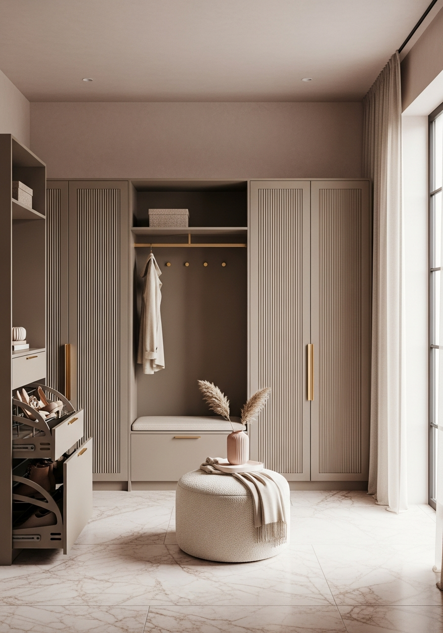 | Capacity and layout | 12-16 pair shoe storage; entry hall built-in with concealed racks and bench seating; humidity-resistant for bathroom-adjacent placement |
