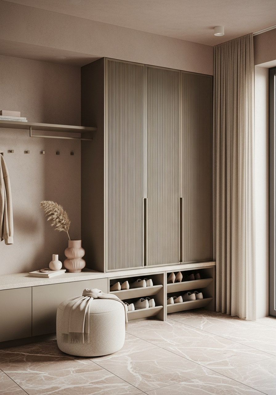 The entry hall built-in composition balances concealed shoe racks with integrated bench seating, using vertical micro-fluting at 15mm pitch to introduce shadow rhythm without ornament. Champagne gold PVD reveals frame the composition at 5mm width — pale warm gold, satin finish, catching light without competing for attention. The matte taupe lacquer finish reads as silk-touch surface with zero sheen, allowing the steel substrate to govern proportion and tolerance while the finish governs atmosphere. Precision shadow-gap reveals replace visible hardware; soft-close mechanisms recede entirely from view.