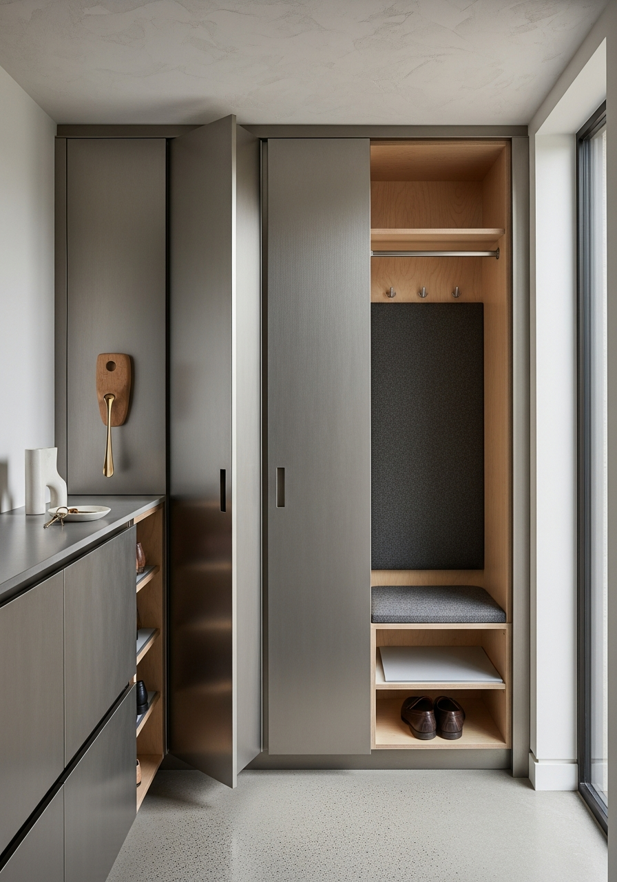Hettich Sensys or equivalent soft-close hinges rated for 200,000+ cycles operate behind flush-mounted folding doors. Touch-latch magnetic push mechanisms eliminate visible pulls; the hardware disappears into the experience of use, aligning with the 2026 shift toward invisible luxury in residential specification.