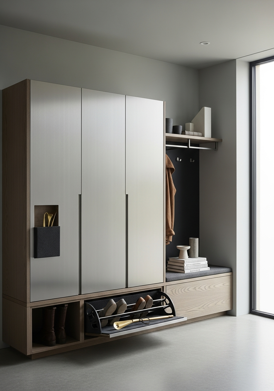 Yes. The layout specification includes entry hall built-in configurations with integrated bench seating and concealed shoe rack systems. Internal zoning — tilted shoe shelves, drawer banks, hanging storage — can be distributed across the vertical composition while maintaining the exterior material rhythm. Bench surfaces can be specified in matching fumed oak or contrasting material. Fadior's seamless steel construction supports cantilevered bench elements without visible structural hardware.