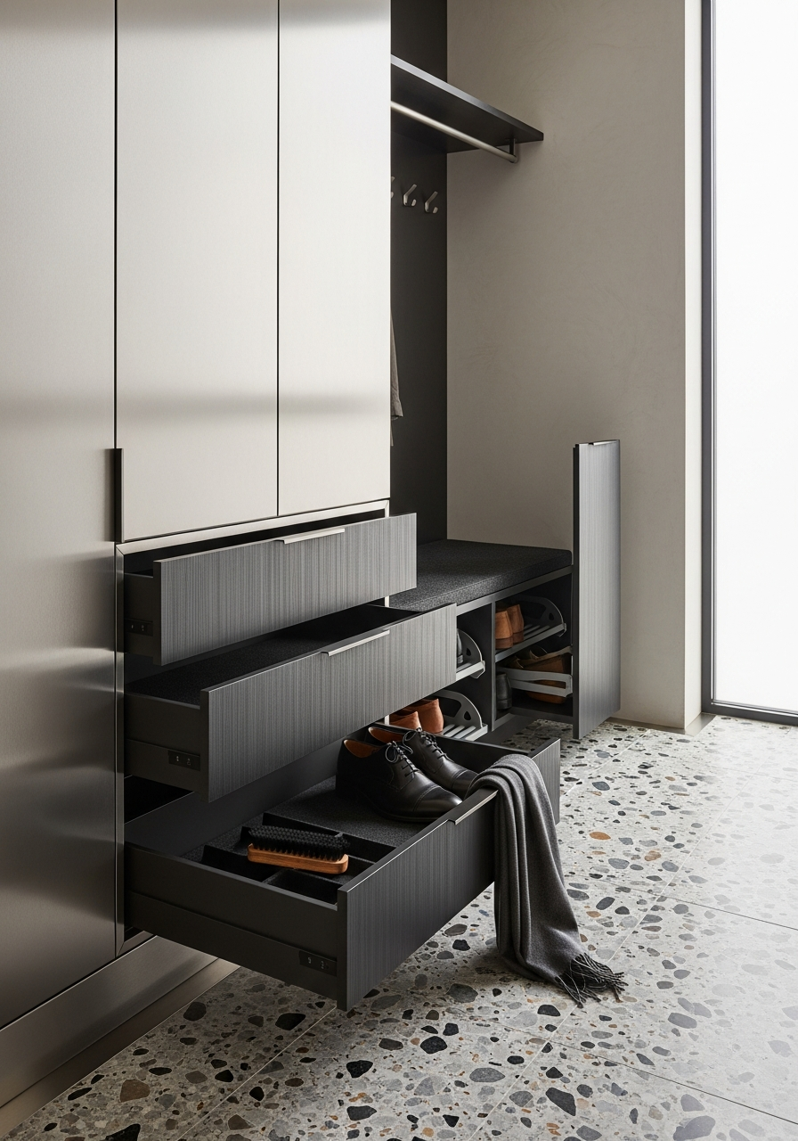 Drawer interiors are fitted with 3mm charcoal technical felt — anti-slip, abrasion-resistant, and specified for direct contact with footwear. The material choice extends the architectural logic of the exterior into every functional surface.