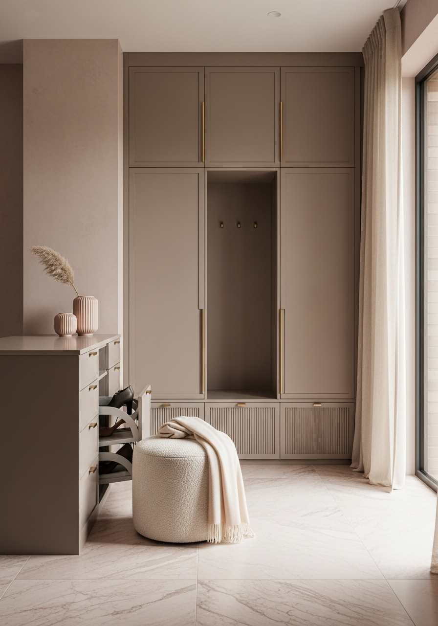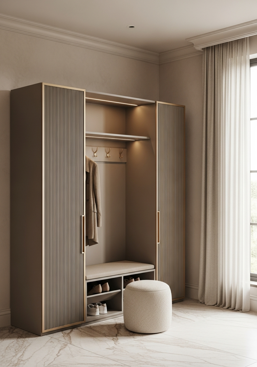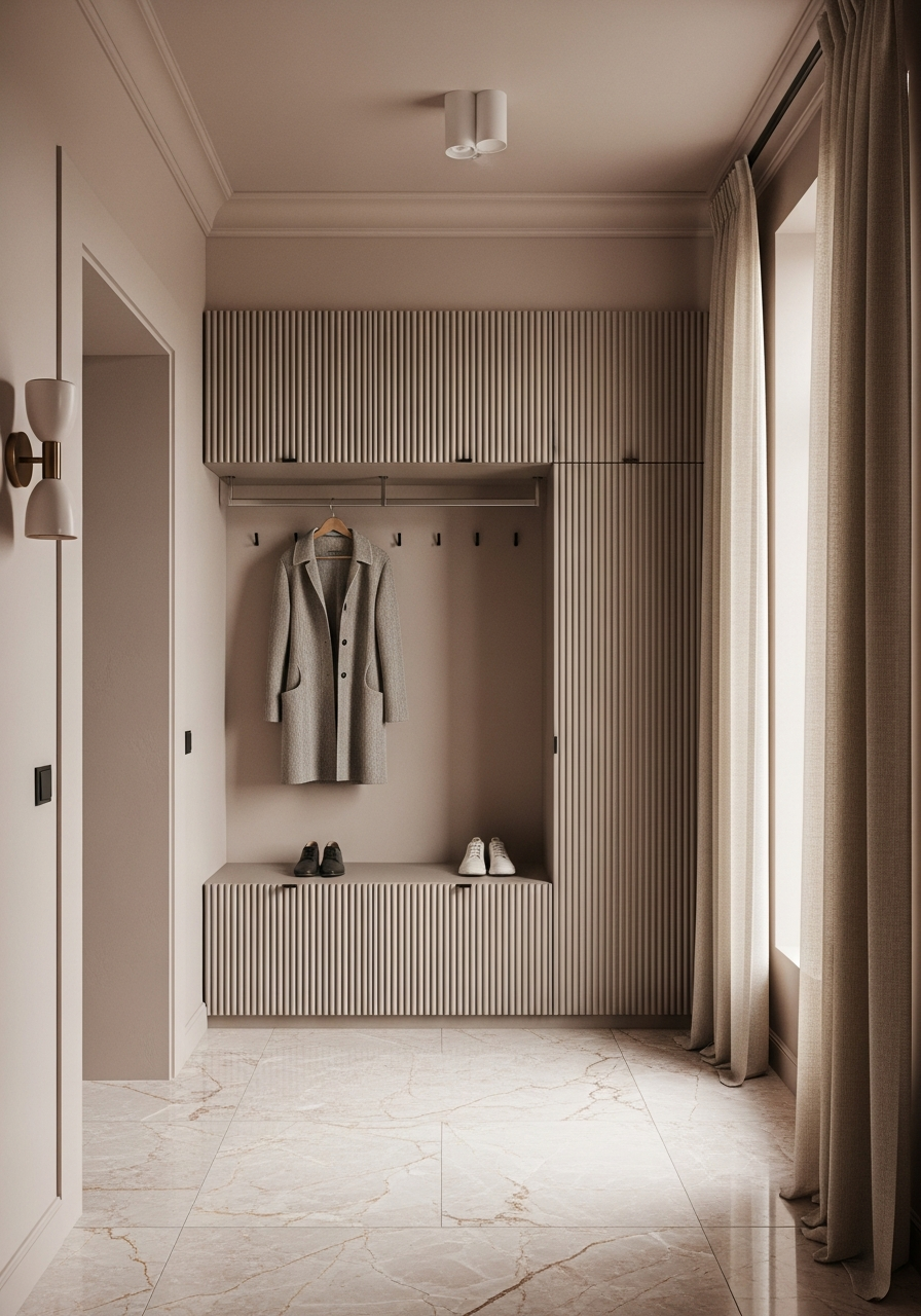 The composition reads as calm, curated, and quietly luxurious — an antidote to sharp minimalism. Vertical proportions keep visual weight low for intimate entry halls and dressing areas where softness is prioritized over statement. Diffused natural light catches the rhythmic fluting, creating subtle shadow play without visual noise. The zero-sheen surface maintains its muted warmth under varying light conditions, never competing with surrounding materials.
