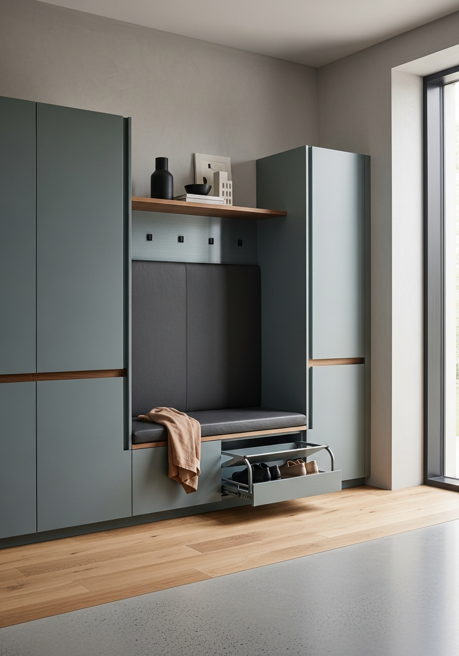 | Layout | Entry Hall Built-In With Concealed Shoe Racks And Bench Seating |