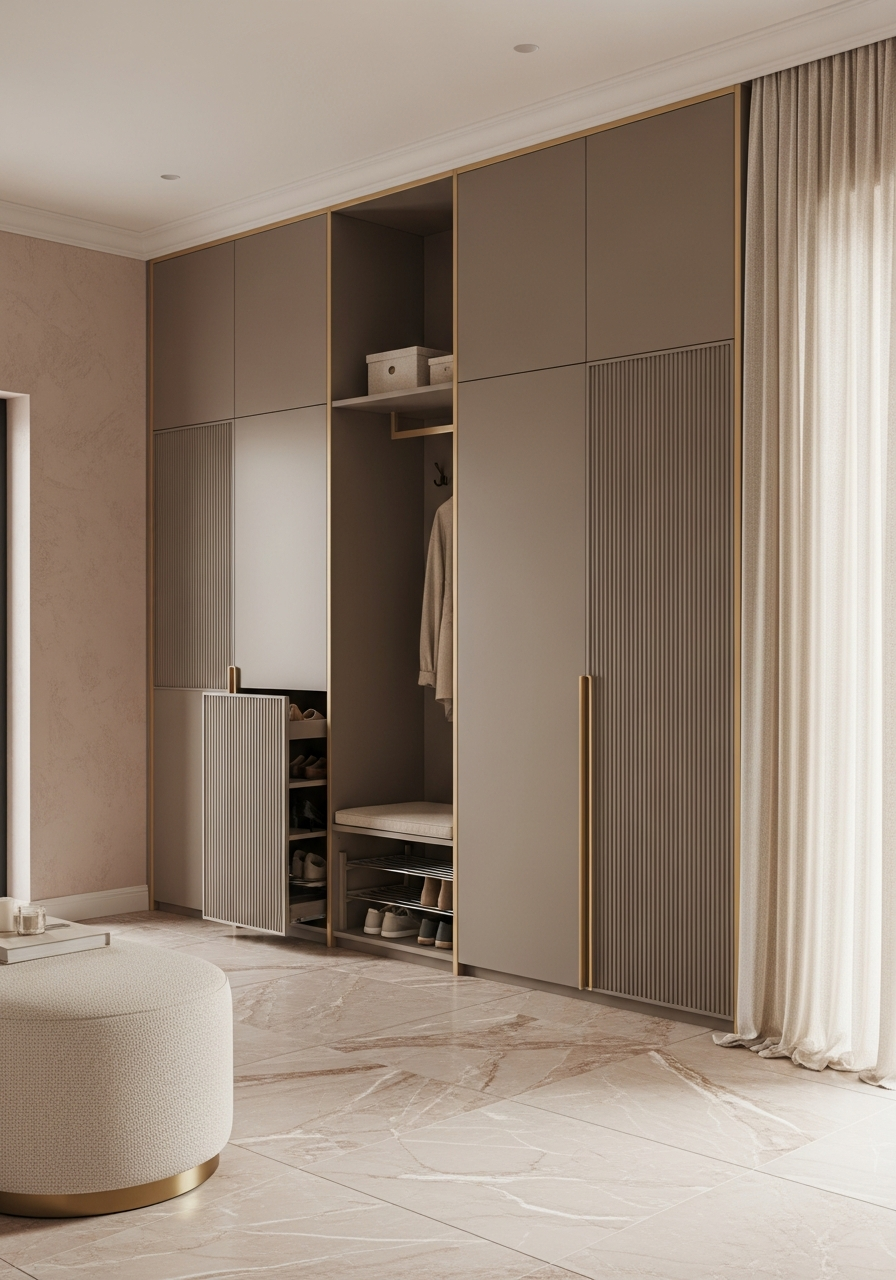 The composition reads as curated warmth rather than industrial utility. Vertical fluting catches diffused natural light through sheer champagne drapery, creating gentle tonal modulation across the taupe surfaces. The champagne gold PVD reveals operate as warm architectural lines — pale enough to avoid yellow dominance, present enough to structure the visual field. The rose marble-veined sintered stone seating ledge sits in tonal conversation with the overall palette, its subtle veining visible only at close range. Proportion, shadow rhythm, and material layering replace decorative gesture.