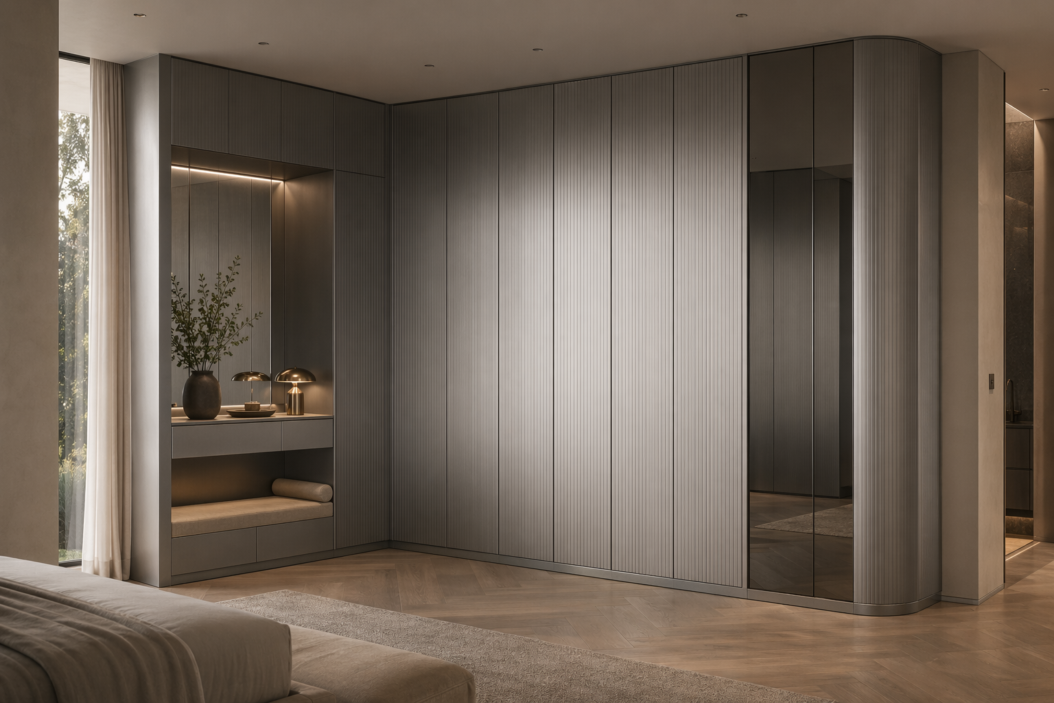 A 304 stainless steel wardrobe suite that softens storage architecture through a fluted corner dressing wall and warm residential calm.