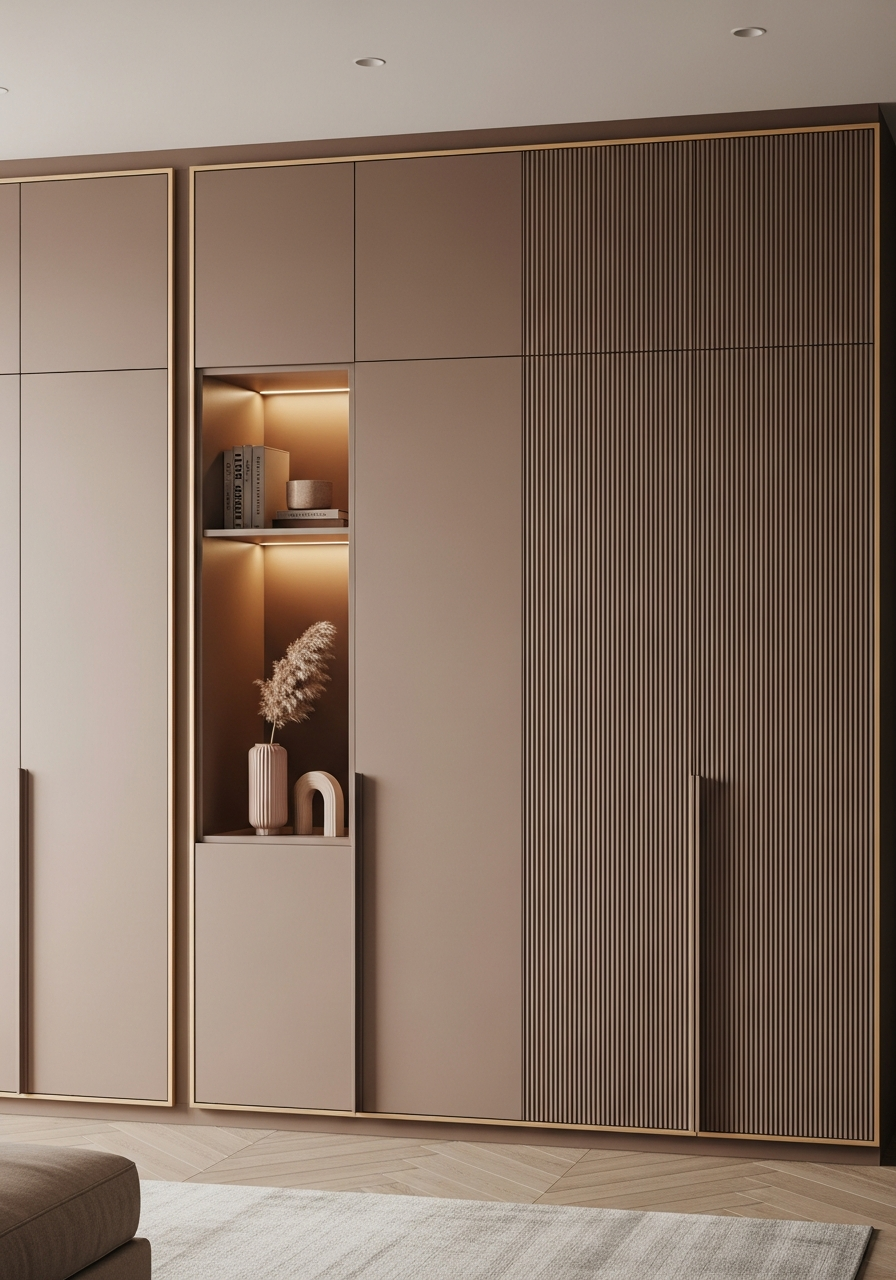The Brera Wardrobe Suite presents as a composition of vertical rhythm and tonal restraint. The 15mm pitch fluting creates dimensional shadow play that shifts subtly with natural light, while the mushroom-taupe lacquer absorbs rather than reflects, maintaining visual calm. Champagne gold PVD reveals at precise 5mm widths function as architectural punctuation — warm enough to prevent coolness, narrow enough to avoid ostentation. The overall effect resembles morning light through sheer drapery: even, warm, quietly luxurious. This is not industrial minimalism softened for residential use; it is a wardrobe system engineered from steel yet resolved for the specific atmospheric requirements of sleeping environments.