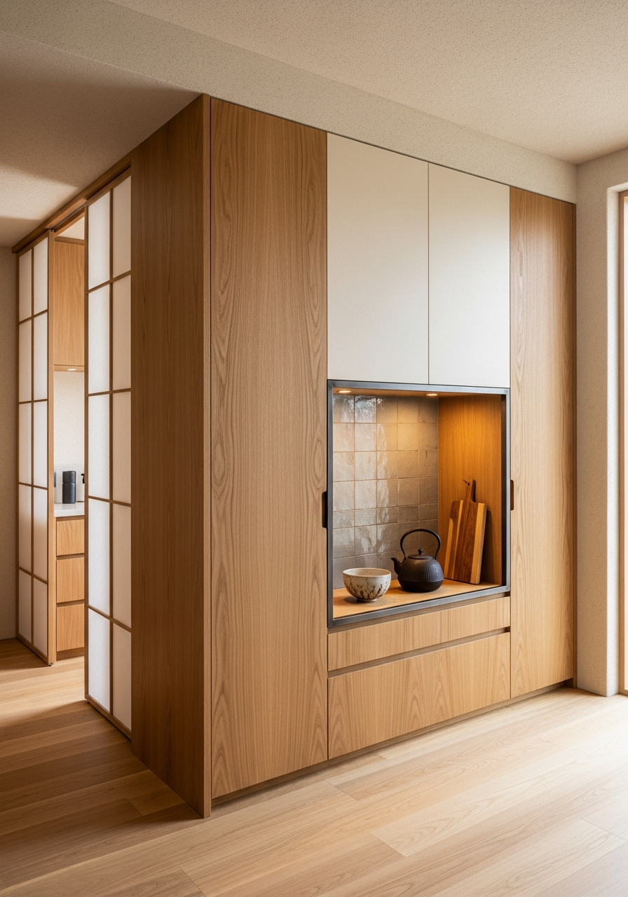 The Quiet Japandi Oak direction governs the material palette: steel-based panels carry a 3D wood-grain transfer finish with straight grain, warm honey tone, and oiled matte surface — the visible grain restrained rather than theatrical. Upper cabinets receive warm parchment white lacquer with eggshell flatness and paper-like surface quality. Thin black iron frames at 20mm visible width provide structural rhythm without visual weight. This is not veneer over substrate; it is steel with surface intelligence, finished through processes that meet the standards Fadior helped write as principal drafter of China's national stainless steel kitchen cabinet standard.
