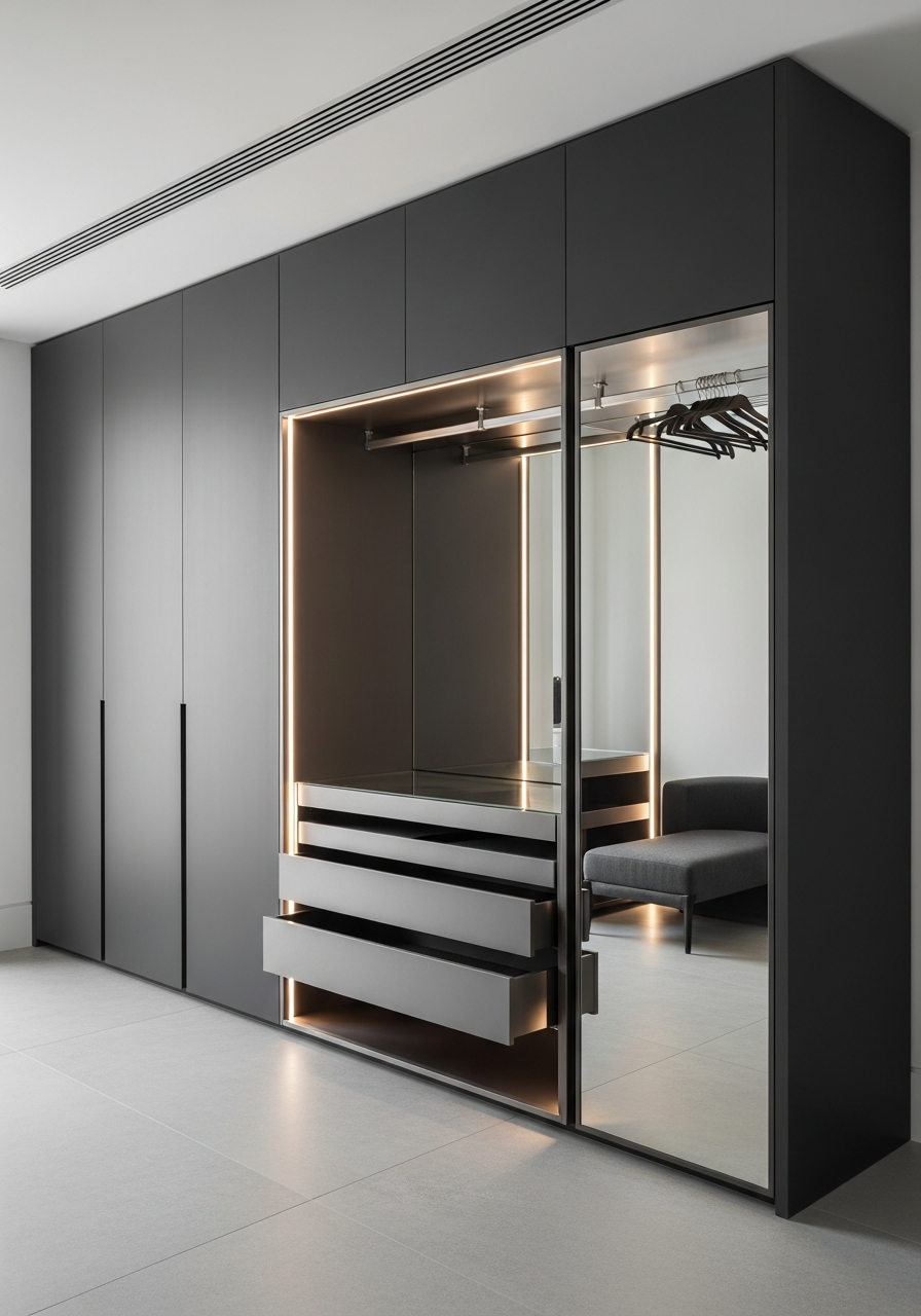 The wardrobe reads as a single charcoal monolith interrupted only by the vertical rhythm of mirror strips. Light from a clerestory band washes evenly across faces, eliminating shadow and emphasizing the precision of 2mm edge radii. The aesthetic rejects display in favor of subtraction: no visible technology, no decorative hardware, no organic texture. The room breathes through the wardrobe's silence.