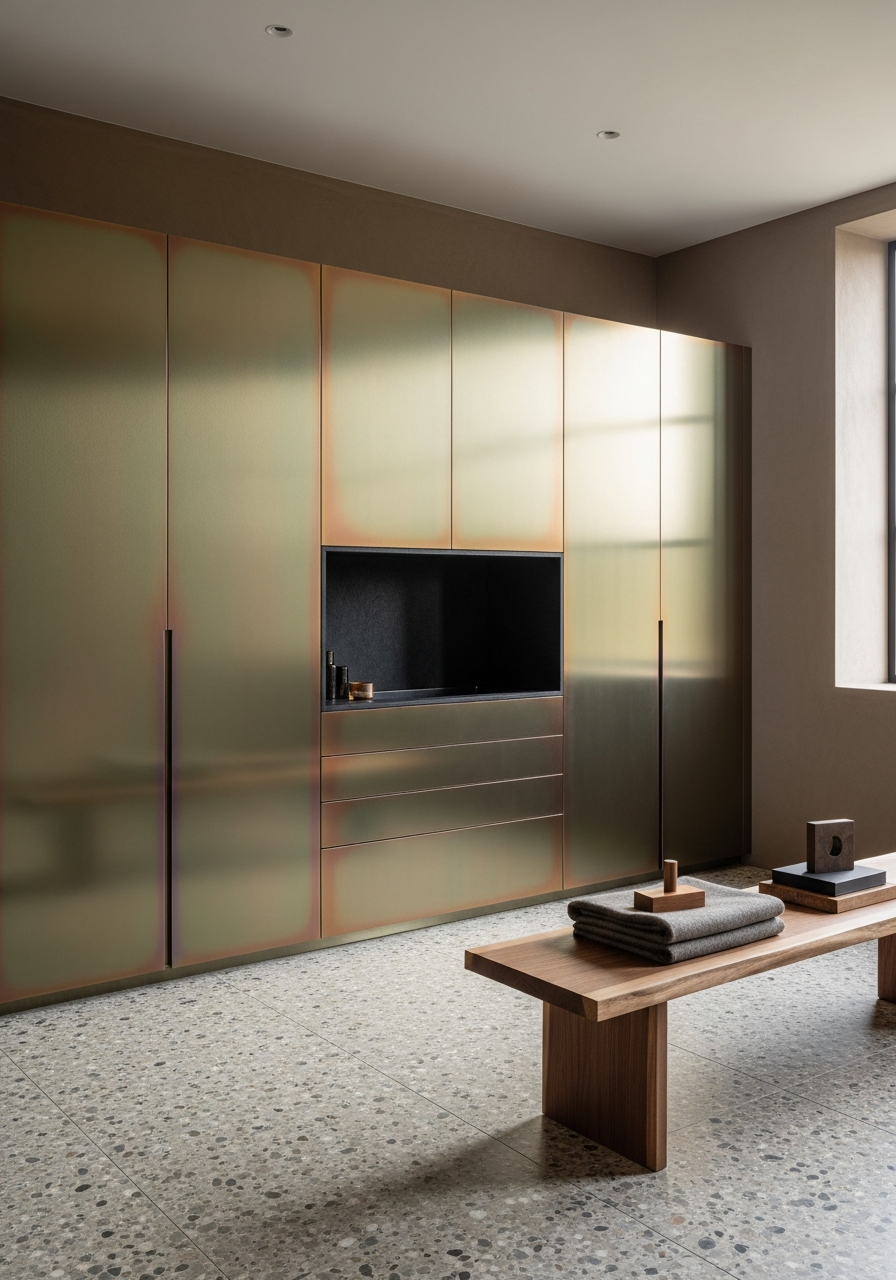 The wardrobe reads as liquid metal frozen in architectural form — 1200mm vertical planes of electrochemical bronze steel where fine linear brushing catches indirect light from above, triggering amber-to-olive color migration across the surface as one moves through the space. Hairline shadow gaps between modules create measured rhythm without visual noise. At open thresholds, deep charcoal microfiber interior lining provides soft mechanical counterweight to the exterior's rigorous minimalism. No handles, no frames, no applied decoration — only the phenomenon of colored steel and the precision of its making.