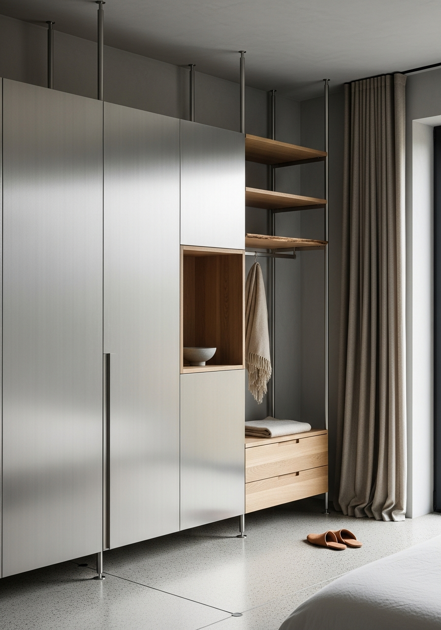 For primary suites where the closet functions as daily-use architecture, yes. The Brera Wardrobe Suite eliminates the concealed cabinet box entirely — the 25mm steel posts and 12mm rails are the structure. This reduces material volume by approximately 40% versus conventional built-ins while achieving superior longevity: 304 stainless steel (ASTM A240) is 100% waterproof, 100% recyclable, and carries Fadior's 30-year cabinet body warranty. The visible joinery also permits reconfiguration without demolition — modules unclip and relocate as needs evolve.
