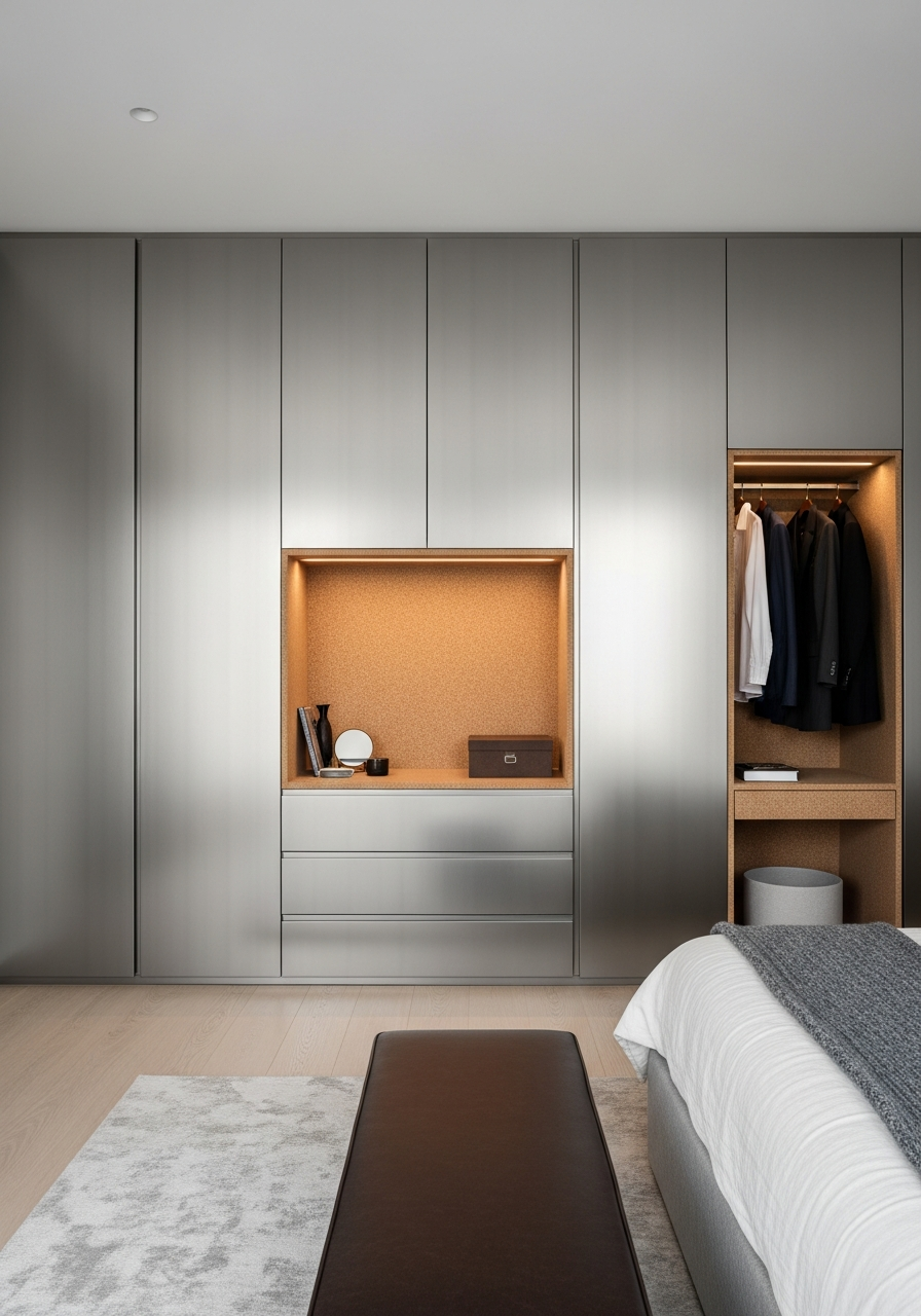 304 stainless steel wardrobe system — seamless construction, zero formaldehyde, a sanctuary-focused design blending metal with organic warmth