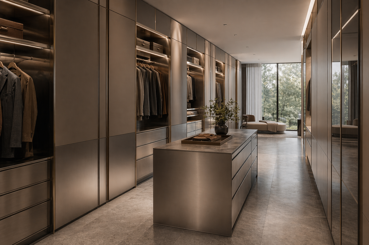 Architectural wardrobe cabinetry with real 304 stainless steel structure and quiet residential luxury.