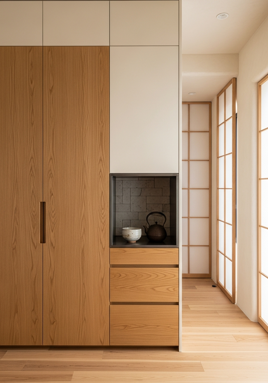304 stainless steel walk-in wardrobe — seamless construction, zero formaldehyde, quiet Japandi oak — a meditation on east-facing morning light, where natural Japanese oak veneer with straight grain and warm honey tone meets translucent shoji-inspired screens.