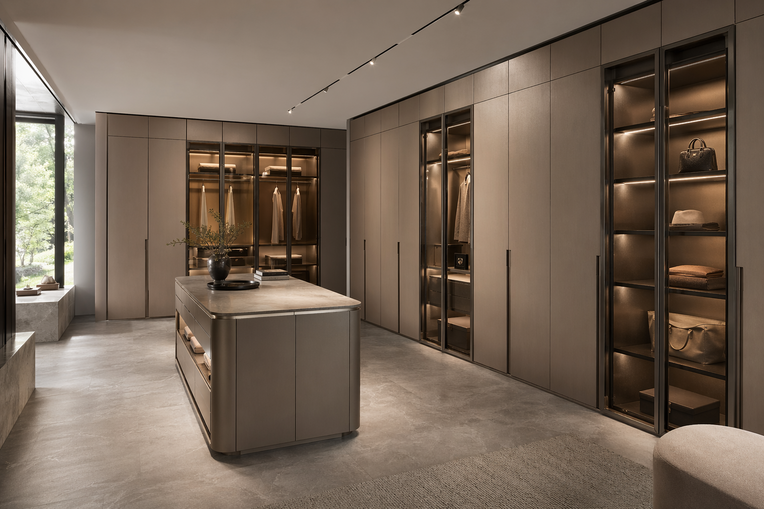 | Finish Direction | warm taupe matte fronts with brushed 304 stainless steel frames and selective smoked-glass accents |