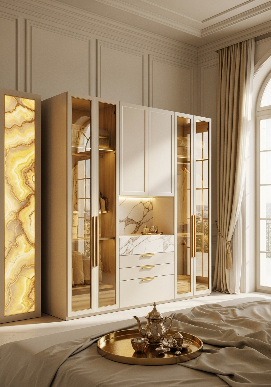The Desert Palace Gold aesthetic channels ambient light through mirror-polished stainless steel profiles that act as conductors rather than reflectors, amplifying the warm amber tones of desert morning. Cream high-gloss polyurethane lacquer panels provide liquid depth without competing for attention, while gold-tinted antique mirror glass introduces deliberate visual distortion — heirloom texture calibrated for contemporary wardrobes. Honey onyx amber LED-lit drawers complete the material palette, their translucent stone fronts glowing from within through integrated diffusion systems.